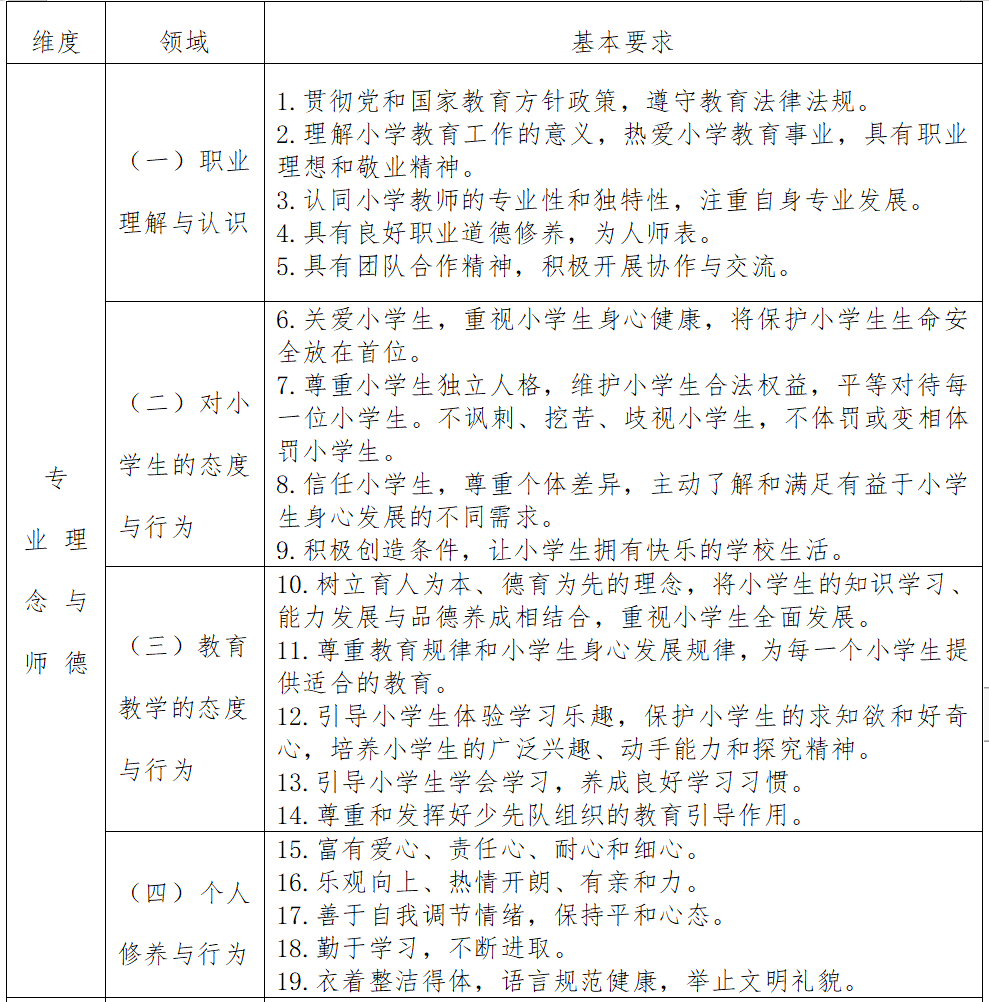 小学教师是履行小学教育教学工作职责的专业人员,需要经过严格的培养与培训,具有良好的职业道德,掌握系统的专业知识和专业技能。《专业标准》是国家对合格小学教师专业素质的基本要求,是小学教师实施教育教学行为的基本规范,是引领小学教师专业发展的基本准则,是小学教师培养、准入、培训、考核等工作的重要依据。