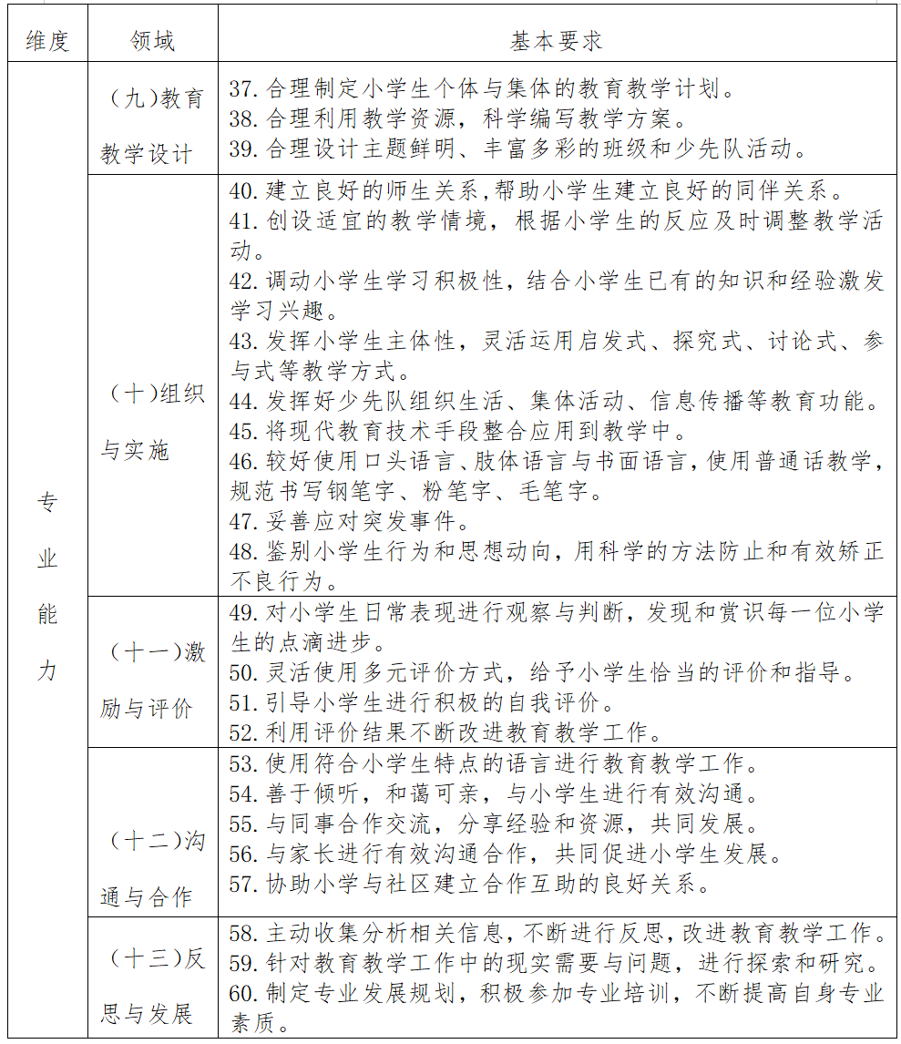 (四)小学教师要将《专业标准》作为自身专业发展的基本依据。制定自我专业发展规划,爱岗敬业,增强专业发展自觉性;大胆开展教育教学实践,不断创新;积极进行自我评价,主动参加教师培训和自主研修,逐步提升专业发展水平。