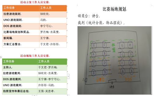 本次活动从比赛方案、设计、分工到会场布置,全部由学生们自己设计。清早10名志愿者提前到活动场地布置,每位同学分工明确,摆放奖品、制作黑板报、立牌整理……快速且有序,在同学们来到教室之前布置好游戏场地。
