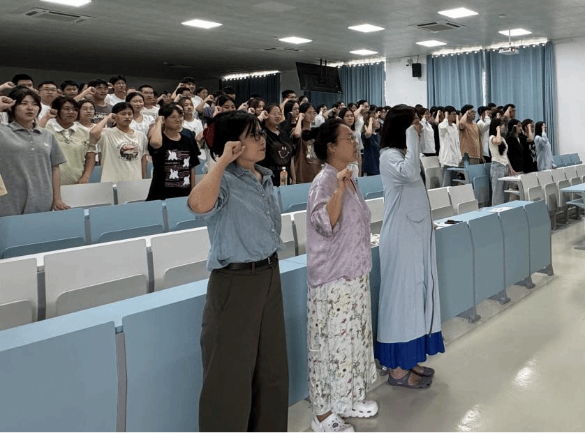 随后,心理学系主任陈晓凤老师为新生们描绘了应用心理学专业的就业前景,从心理健康教师到心理咨询师到人力资源顾问等多个职业方向,为新生们提供了丰富的职业选择。在会议的高潮部分,全体新生在系主任和教师的见证下,进行了庄严的宣誓仪式。他们举起右手,面对鲜红的国旗和庄严的誓词,许下了对心师的承诺:“我志愿投身教育事业,秉承宣德育人,衍道敦行的琼台校训常怀忠诚爱国之念,勇担民族复兴之责,夯实专业发展之基,坚守教书育人之本。励志勤学,刻苦磨炼,健康成长,在激情奋斗中绽放青春光芒。