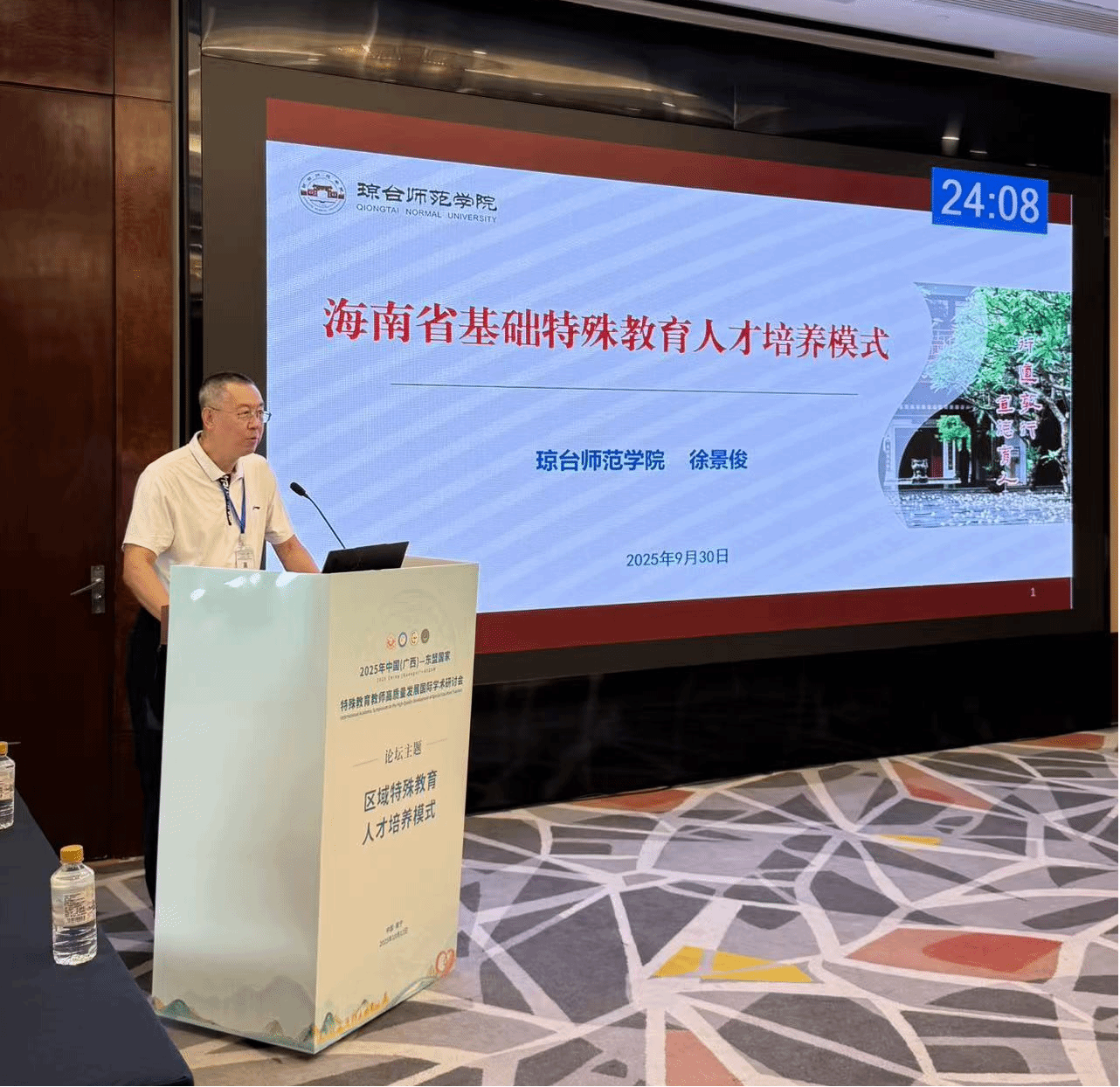 会议期间,徐景俊院长以“海南省基础特殊教育人才培养模式的探索与实践”,从培养定位、课程架构、实践体系等维度,系统阐释我院在特教人才培养中的创新路径与阶段性成果。周麟、董文学两位老师积极参与分论坛交流及专题讨论等环节,围绕课程建设、实践教学与校地合作等议题与参会专家深入交流,进一步展示了我院在服务地方特殊教育发展方面的实践探索。