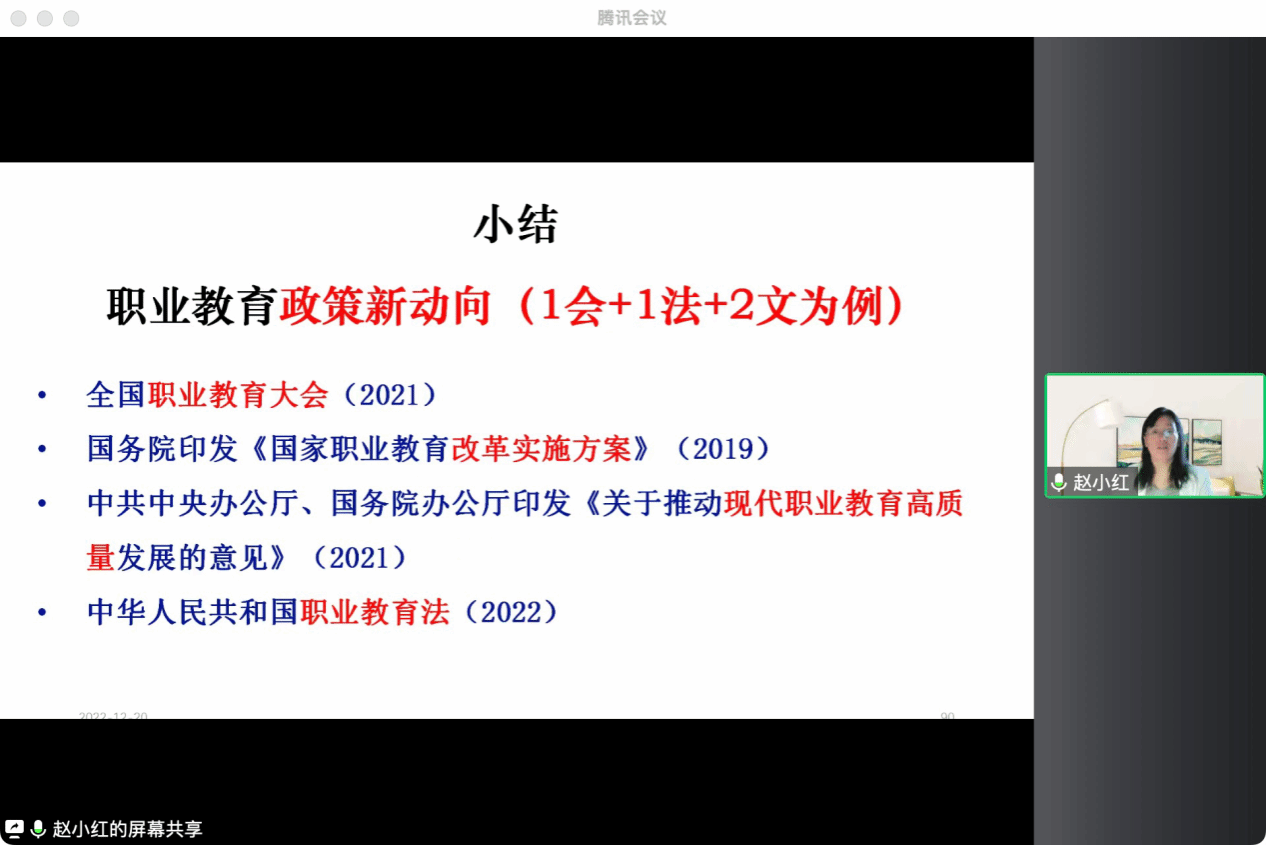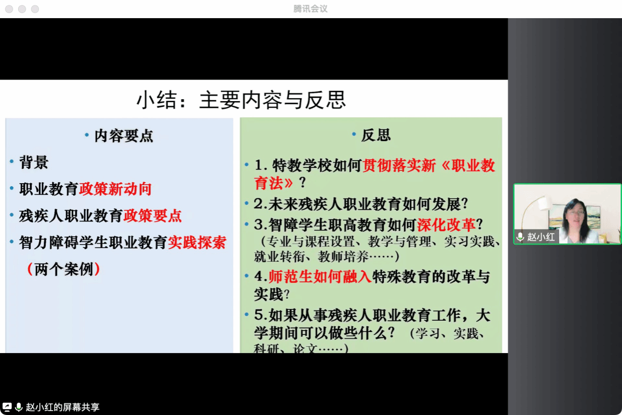 在第一环节中,赵小红副所长首先介绍了职业教育的背景,讲述了大力发展残疾人职业教育的意义与职业教育政策新动向,并对残疾人职业教育相关的重要条款进行了分析。