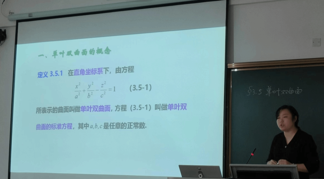 本次活动分三个环节进行。首先是两位党员教师上观摩展示课。副院长李文婷通过《单叶双曲面》的精彩互动教学,将单叶双曲面方程、图形及其应用深入浅出地融入各个教学环节,思路清晰,逻辑严谨,呈现给现场观众一节优秀的示范课。