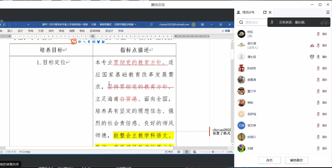 根据学校就“人才培养方案”修订的相关要求,教师教育学院于2023年10月25日晚上召开线上人才培养方案修订专家指导会。会议邀请了湖南师范大学谭长银教授进行线上指导,副院长王河滨主持,各专业负责人及学院全体老师参会。