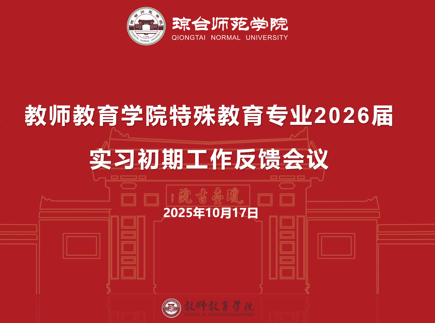 为总结实习初期工作情况,通报和反思存在的问题,进一步规范实习管理,保障实习工作高效有序推进,教师教育学院特殊教育系于2025年10月17日晚通过线上会议形式召开了2026届实习初期工作反馈会议。会议由周麟老师主持,相关负责人和带队教师,以及2026届特殊教育专业全体实习生参加。会议围绕实习纪律、安全规范、论文进度及下一阶段工作进行了全面通报和部署。