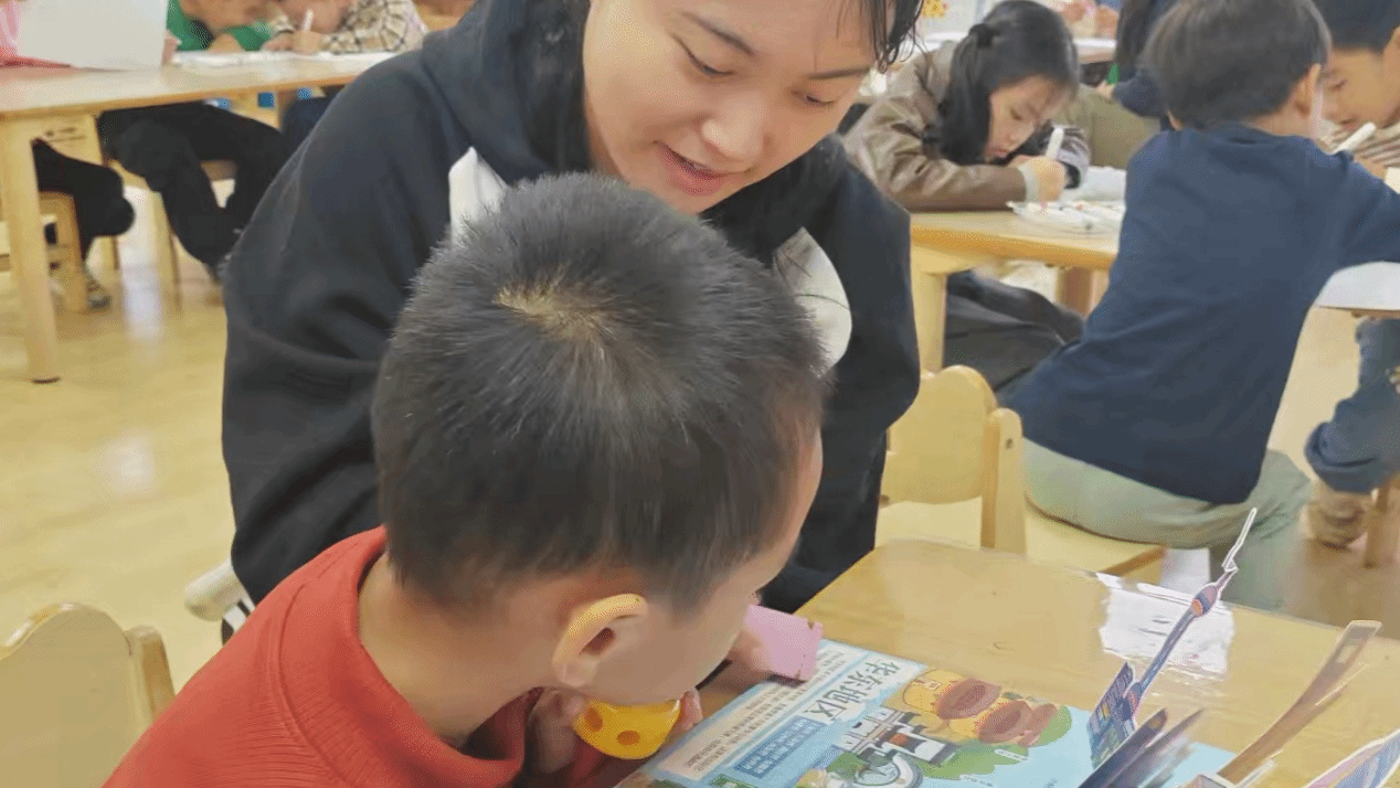 附属幼儿园的实习生以活动为载体,守护幼儿探索天性。阅读区里,实习生与幼儿共读立体书,在陪伴中提升幼儿语言表达能力。实习生通过耐心引导、示范讲解,鼓励幼儿动手尝试、互相讨论,在轻松氛围中培养问题解决能力。