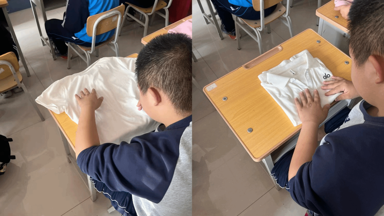 呼和浩特市特殊教育学校的实习生聚焦高年级学生生活技能提升,开展叠衣物教学。实习生先结合学生认知特点拆解操作步骤,示范动作要领,再逐一对学生进行指导,帮助学生逐步掌握衣物折叠技巧,切实提高生活自理能力,让特殊学生在技能学习中收获自信与成长。