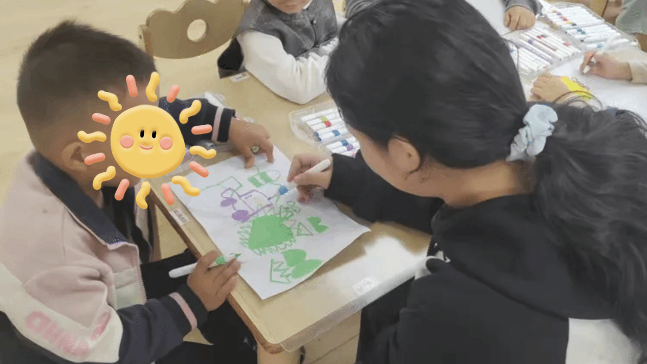 在美术角,实习生协助老师准备画材,为孩子们分发水彩笔,指导孩子调整笔触,鼓励他们大胆创作。阅读区里,实习生陪伴孩子创作卡片,守护自主探索的乐趣。