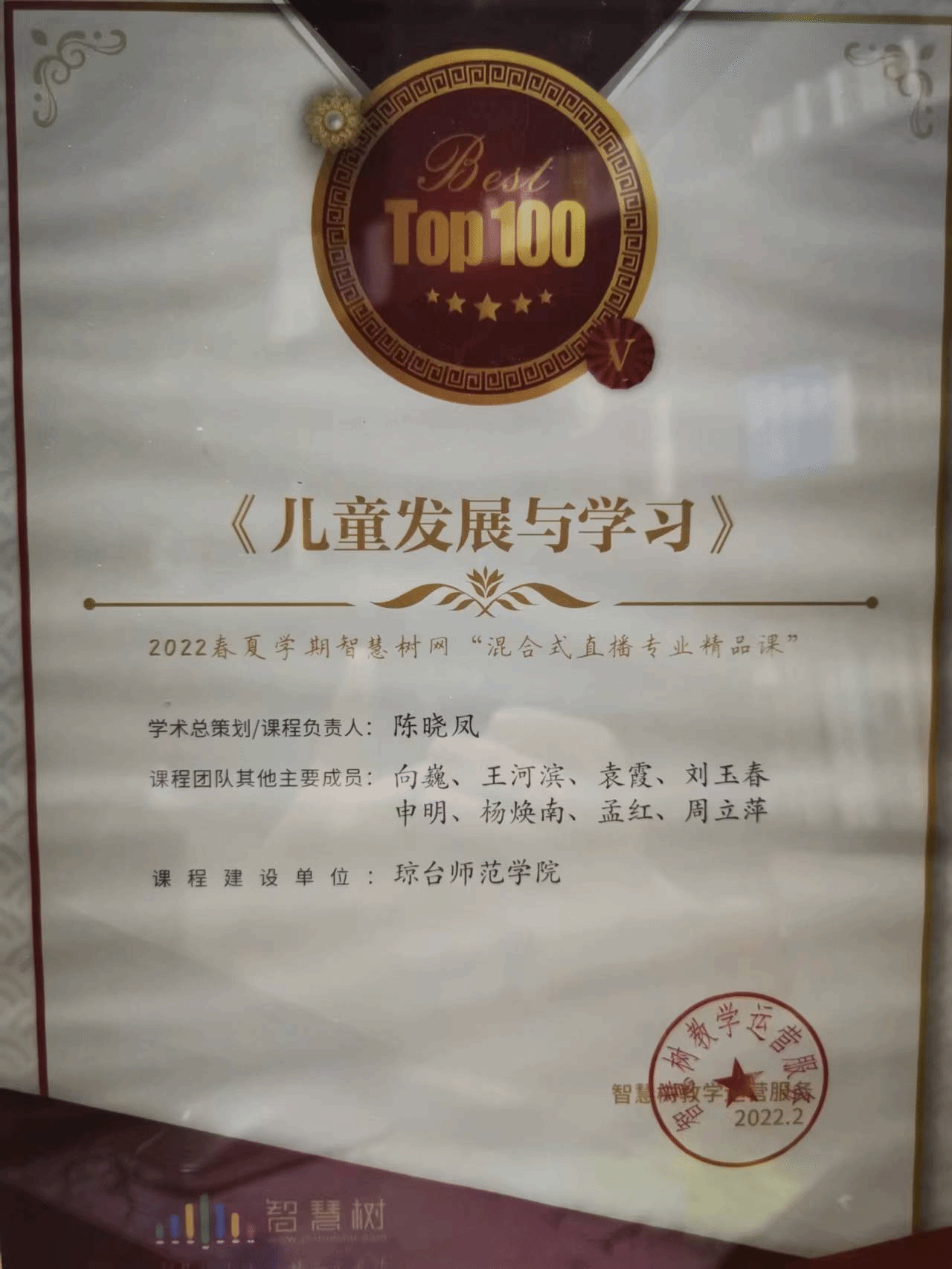 近日,由我院陈晓凤老师主持的省级网络精品在线课程《儿童发展与学习》,继课程上线国家平台之后,又喜获2022春夏学期智慧树网“混合式直播专业精品课”。据悉,为了共享优质教育资源,促进教学方法改革,提升中国人才质量,作为全球大型的学分课程运营服务平台的智慧树网,每学期会从上万门高等学校优质课程中精选100门,成为学期“混合式直播专业精品课”。
