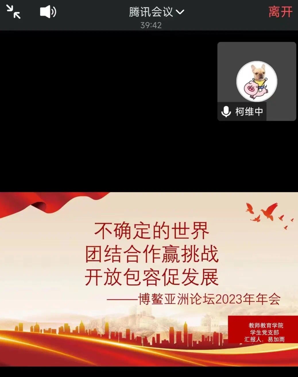 为了学习贯彻党的二十大精神,培养建设海南自贸港的新时代青年,教师教育学院学生党支部依据海南自贸港3月27日至4月2日一周大事记——博鳌亚洲论坛2023年年会召开,特开展聚焦“博鳌亚洲论坛”专题学习交流会,重点学习习近平主席五次“博鳌演讲”金句以及李强总理在博鳌亚洲论坛2023年年会开幕式上的主旨演讲。此次学习于4月3日下午以线上腾讯会议的方式展开,由易加雨同志领学,支部全体党员参会。