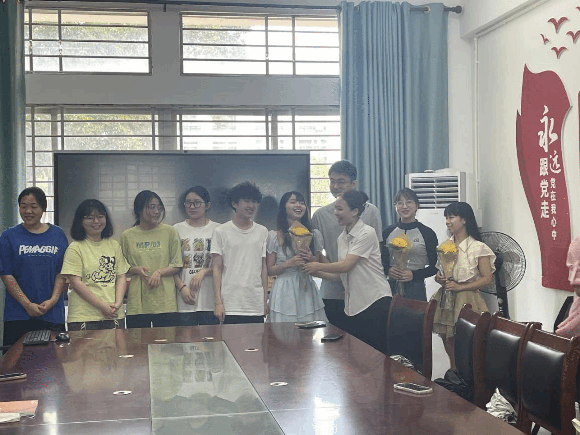 随后,在校生党员为毕业生党员送上鲜花和祝福,祝福他们毕业快乐,前程似锦。在校的党员们也纷纷表示会传承党员学长学姐们的优良作风,为支部建设贡献自己的力量。