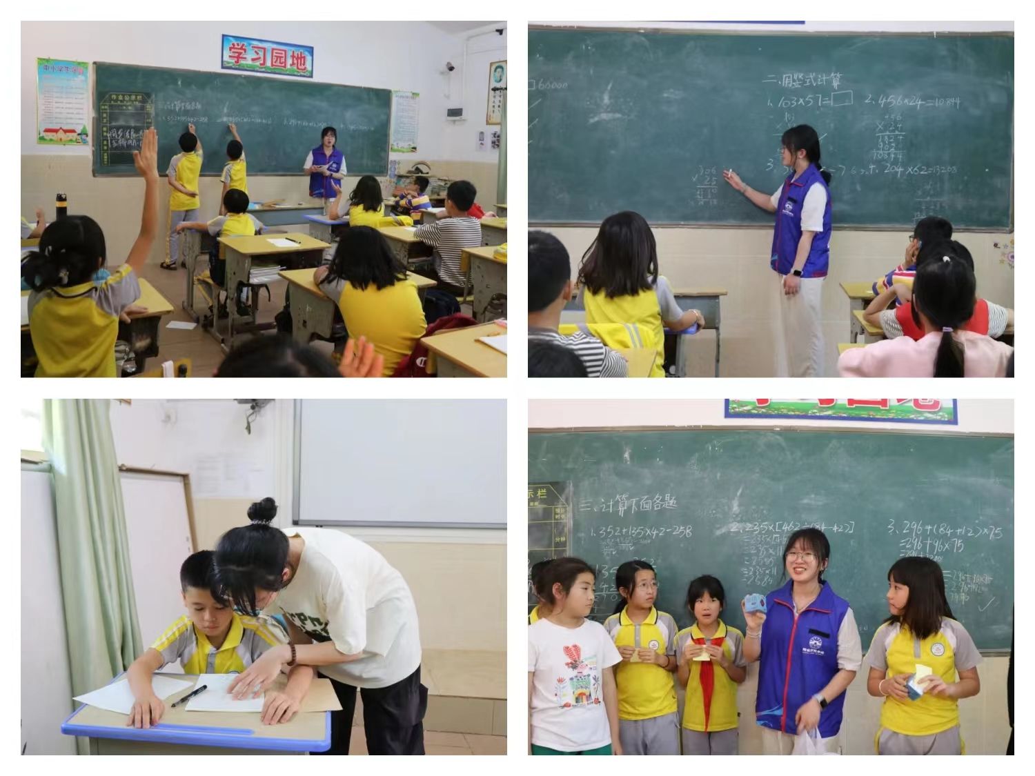 课堂上,支教的志愿者们提前将数学计算题写在黑板上,鼓励学生们积极举手上台练习,指出学生们的细节问题,鼓励每一个认真的孩子们。