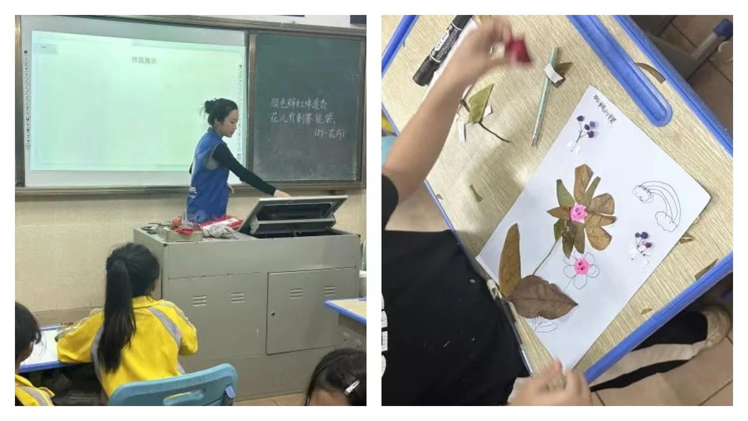 在二三年级的手工课上,老师们为孩子们带来了多样的树叶,孩子们在白纸上尽情描绘着属于他们五彩斑斓的内心世界。