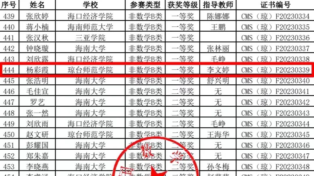 祝贺在第十五届全国大学生数学竞赛海南赛区中,我院2021小学教育2班杨彩霞同学获得省级一等奖,2022小学教育5班何冰洁同学获得省级三等奖!
