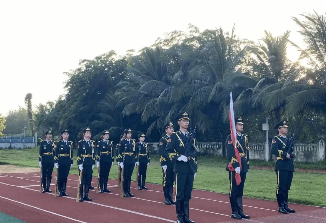 在朝阳下,国旗护卫队以挺拔的身姿,踏着铿锵正步向主席台迈进。随着《义勇军进行曲》的响起,升旗手振臂,将五星红旗升起,五星红旗在阳光下显得愈发夺目。微风吹过,红旗昂扬展开,全体师生端正身姿,行注目礼,深怀对祖国的热爱与敬意,高唱国歌。