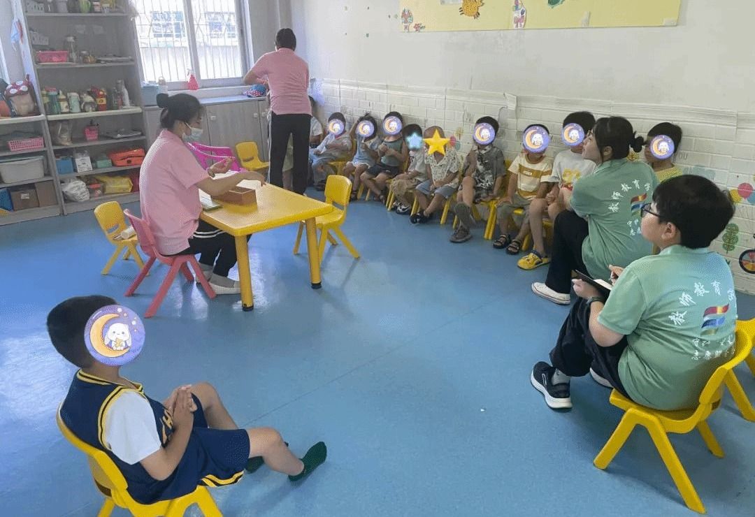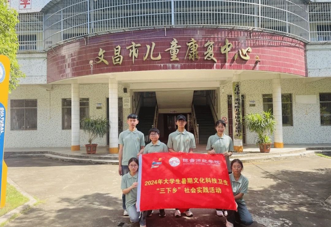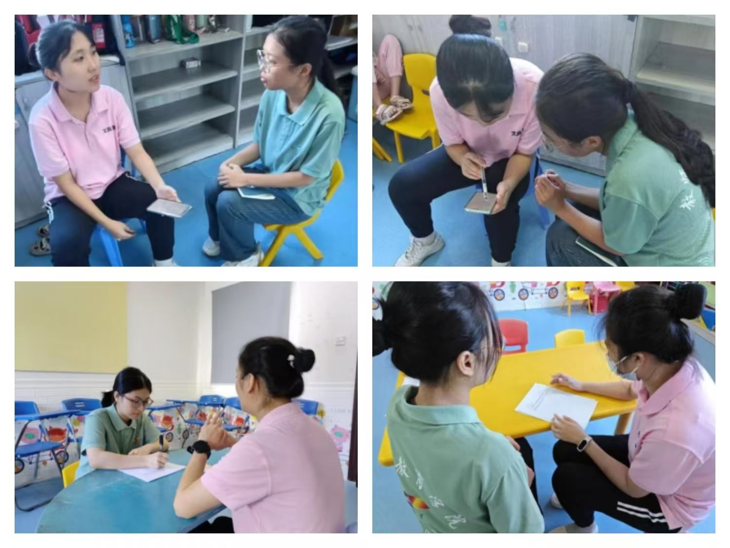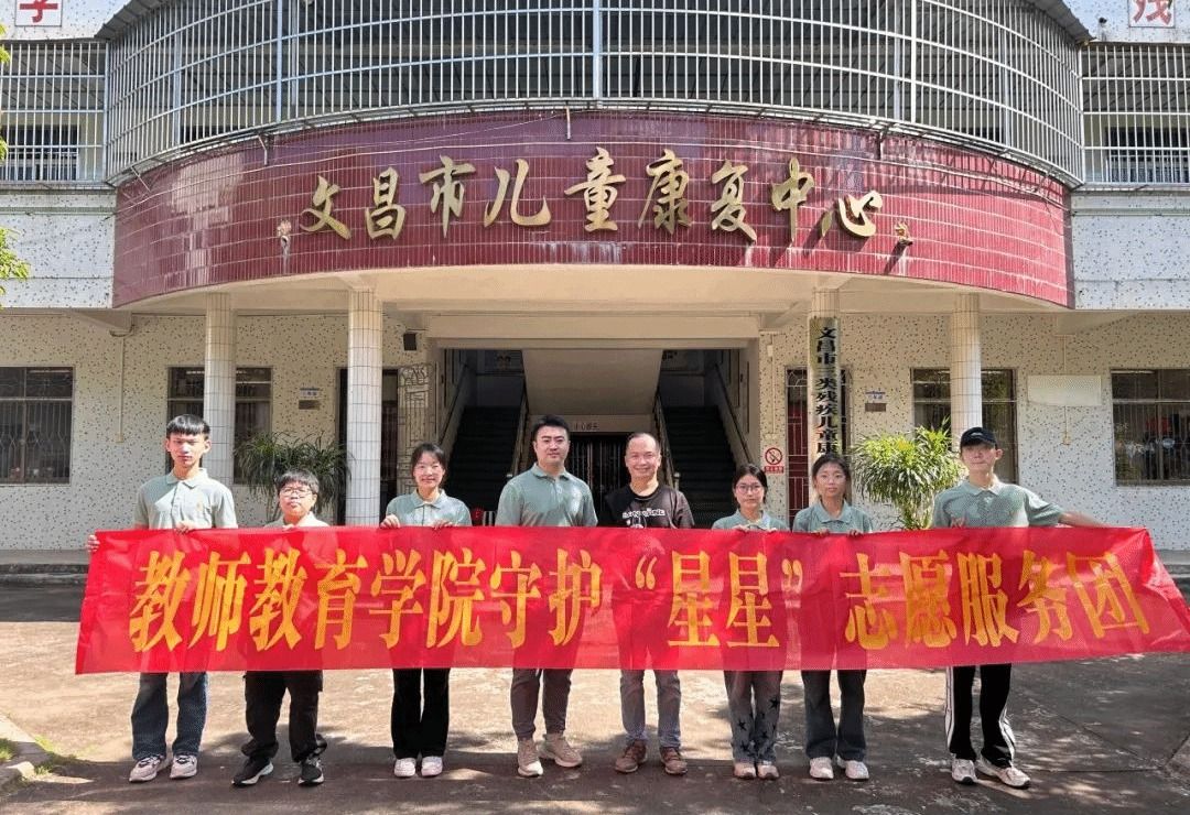 为推进特殊教育事业发展,2024年7月11日,教师教育学院守护“星星”志愿服务团一行七人前往本次社会实践活动的第二站——文昌市三类残疾儿童康复培训中心,通过深入访谈与实践体验,从家庭、学校、社会三个维度探究一线特殊教育现实情况,积极与特殊儿童进行交流互动。