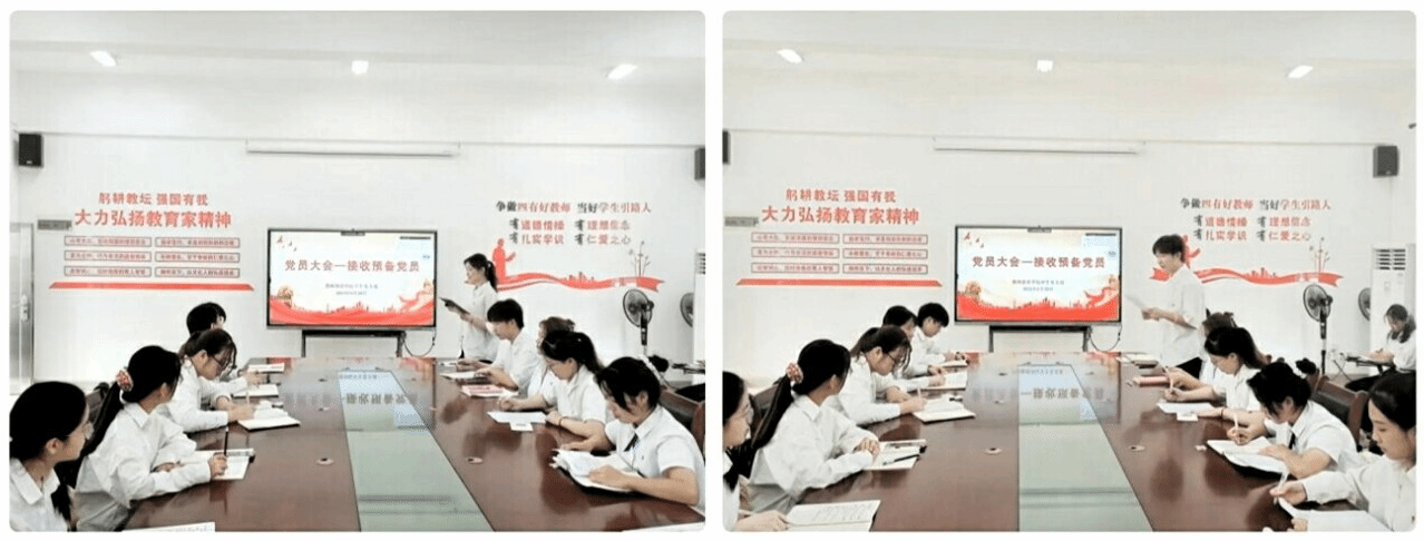 会议最后,支部书记吴莲老师对会议进行总结,宣布同意接收杨景茹等6位同志为中共预备党员。
