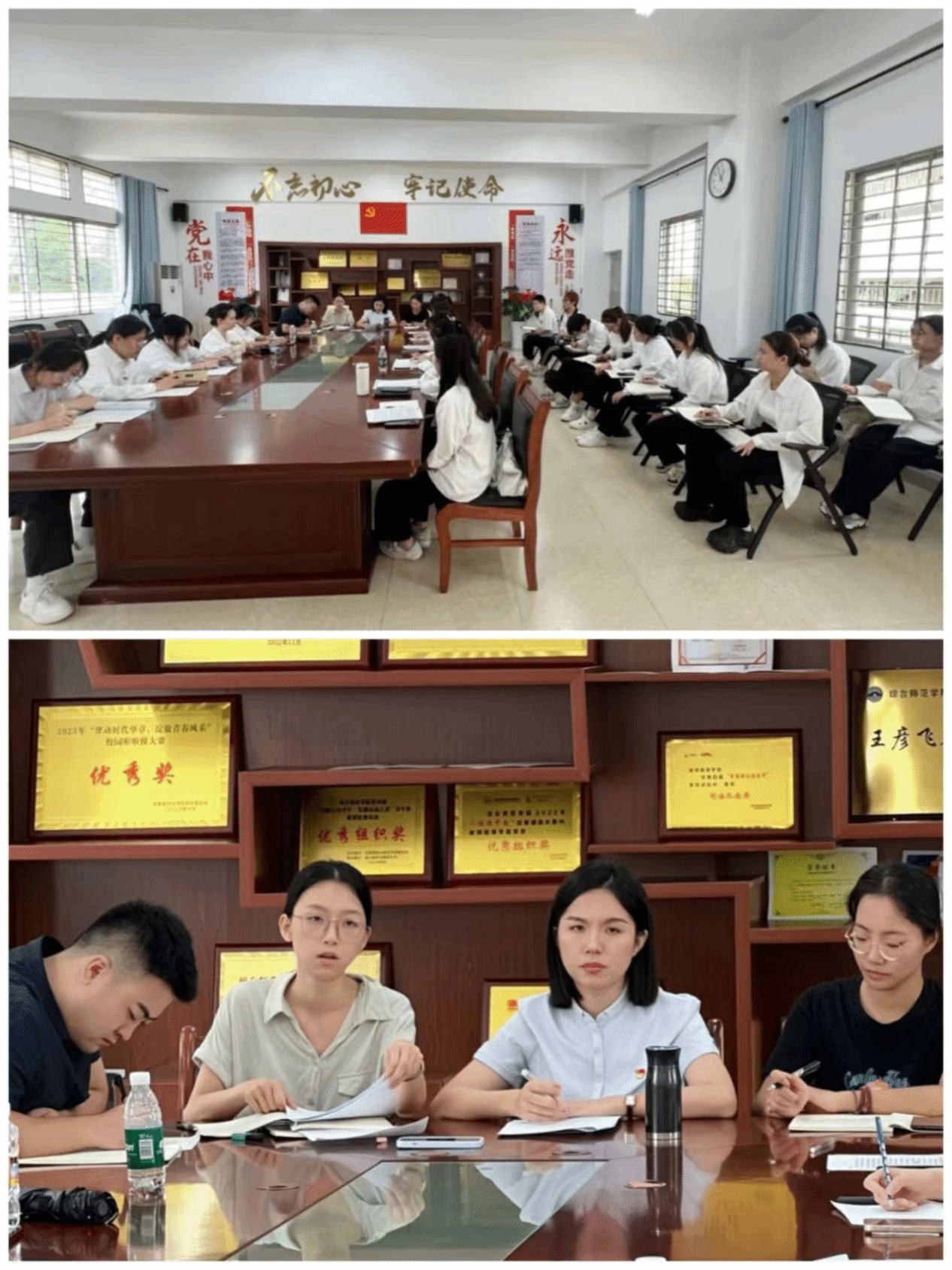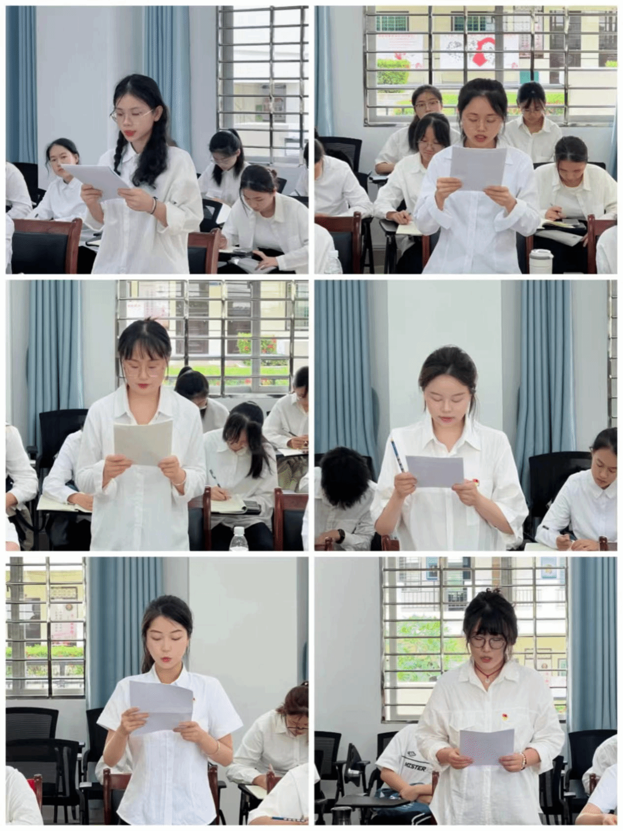 由施孟楠、覃玥、高千千、徐绍倩、谢惠妹、吴惠敏6位同志依次进行个人情况汇报。会上,预备党员们认真宣读了转正申请,总结汇报了自己在预备期间的表现、思想认识、工作生活情况以及目前仍然存在的不足等,并表明了自己不断向党员标准靠拢、坚定入党的决心。