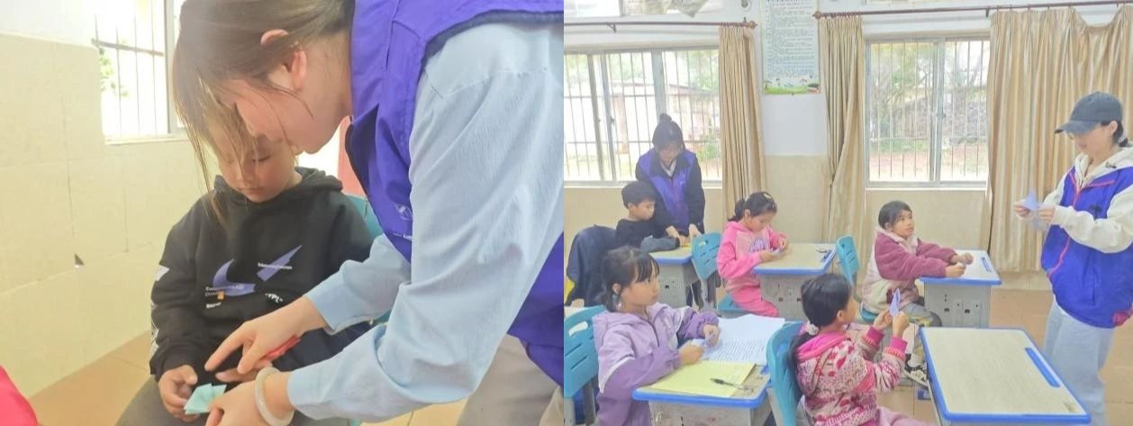 在二三年级课堂上,志愿者满怀热情,手把手教同学们折叠技巧。大家一起动手,将彩色折纸变成了一朵朵娇艳的花朵。课堂上,同学们动手和手眼协调能力得到提升,还在与志愿者的互动中学会主动沟通、积极协作。友善互助的种子在交流里悄悄种下,滋养着孩子们的心灵,伴其成长。