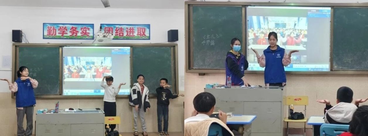 在四年级课堂上,志愿者教孩子们跳《虫儿飞》手势舞。轻柔的旋律中,孩子们跟着志愿者,用小手模仿虫儿的俏皮飞舞。这不仅锻炼了他们手眼协调能力,还激发了想象力与创造力,让孩子们尽情展露童真。同时,歌曲中对美好生活的向往与对亲情的珍惜,也在他们心间悄然扎根。