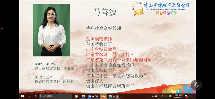 本次讲座诚挚邀请佛山市禅城区启智学校副校长——马善波老师(中共党员,硕士研究生,特殊教育正高级教师,广东省特级教师,广东省第十三届党代表、佛山市委委员、佛山市第十三届党代表、佛山市禅城区第五届人大代表),为我院特殊教育专业的学生进行经验交流与分享。