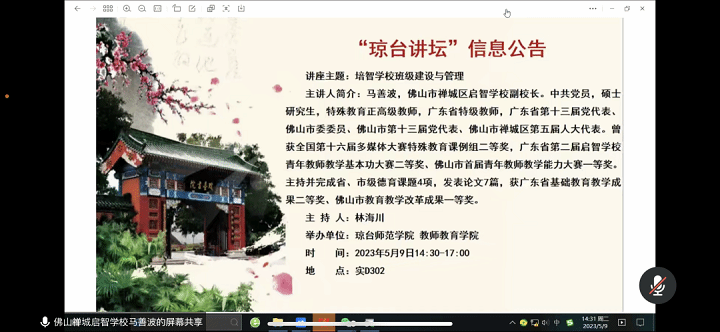 为推动教师教育学院特殊教育专业的学生了解与学习有关特殊教育学校的班级管理知识,探索培智学校的班主任工作经验,我院于2023年5月9日14:30在实D403、实D404教室举行“培智学校班级建设与管理”专题讲座。