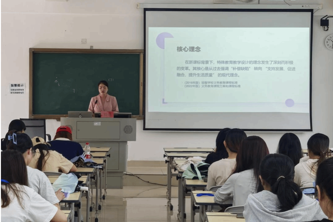 讲座中,刘亮老师重点解读了新课标背景下特殊教育理念的核心变革——从“补偿缺陷”转向“支持发展、促进融合、提升生活质量”。她结合真实教学案例,生动展示了如何以生活为导向进行教学设计,从家庭、校园和社区等场景中提炼核心能力目标,通过情境模拟、实操训练及针对性的课程评价,深化了实习生对生活适应课程的理解。