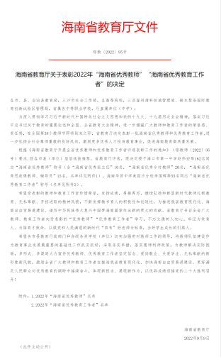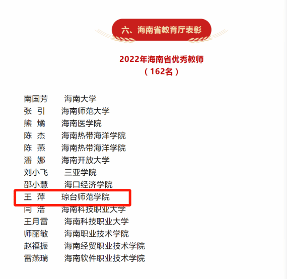 同庆第38个教师节之际,热烈祝贺我院王萍副院长在“2022年中央宣传部、教育部、海南省教育厅联合表彰的教育系统先进个人”活动中,获评“海南省优秀教师”称号。