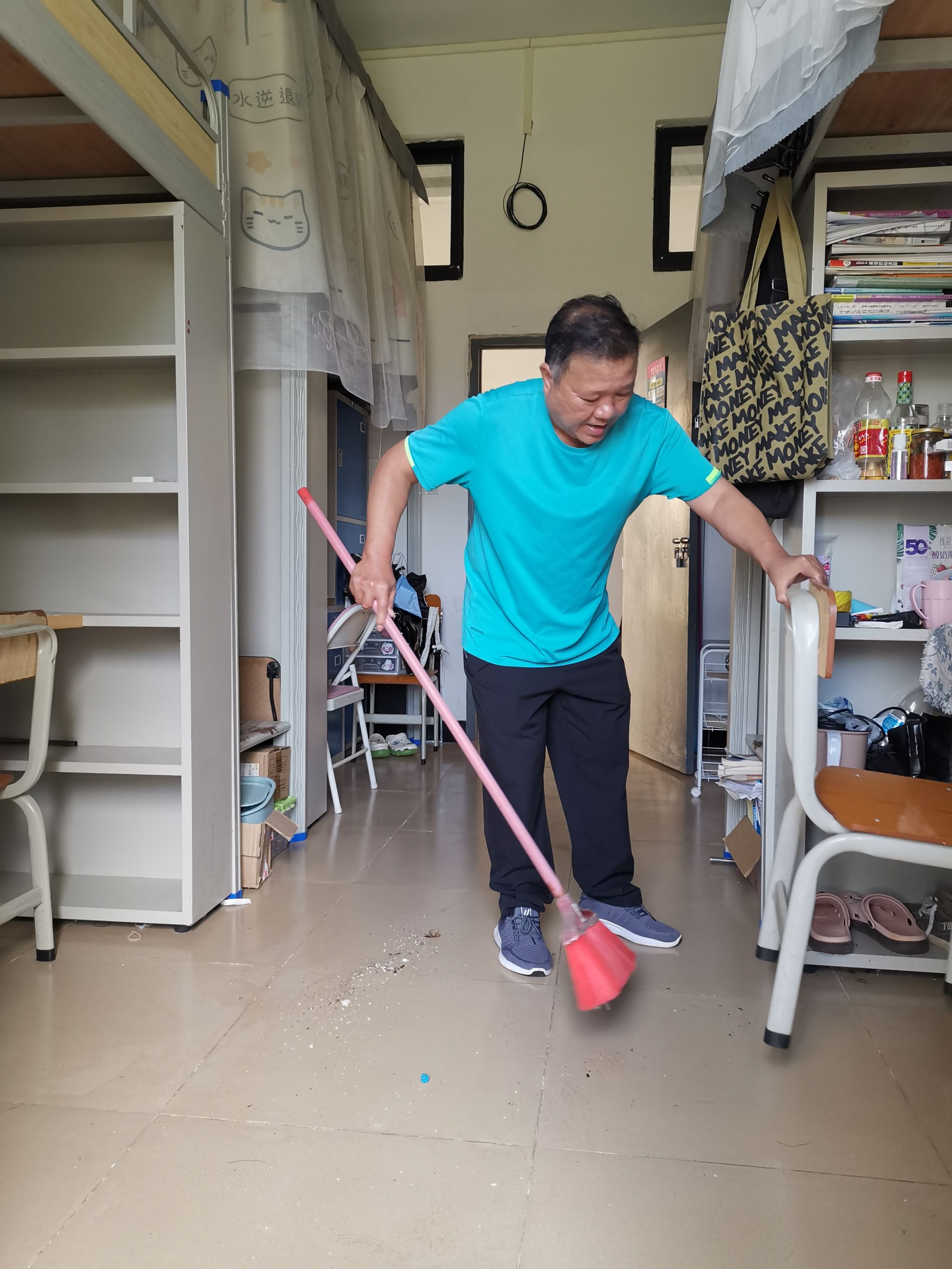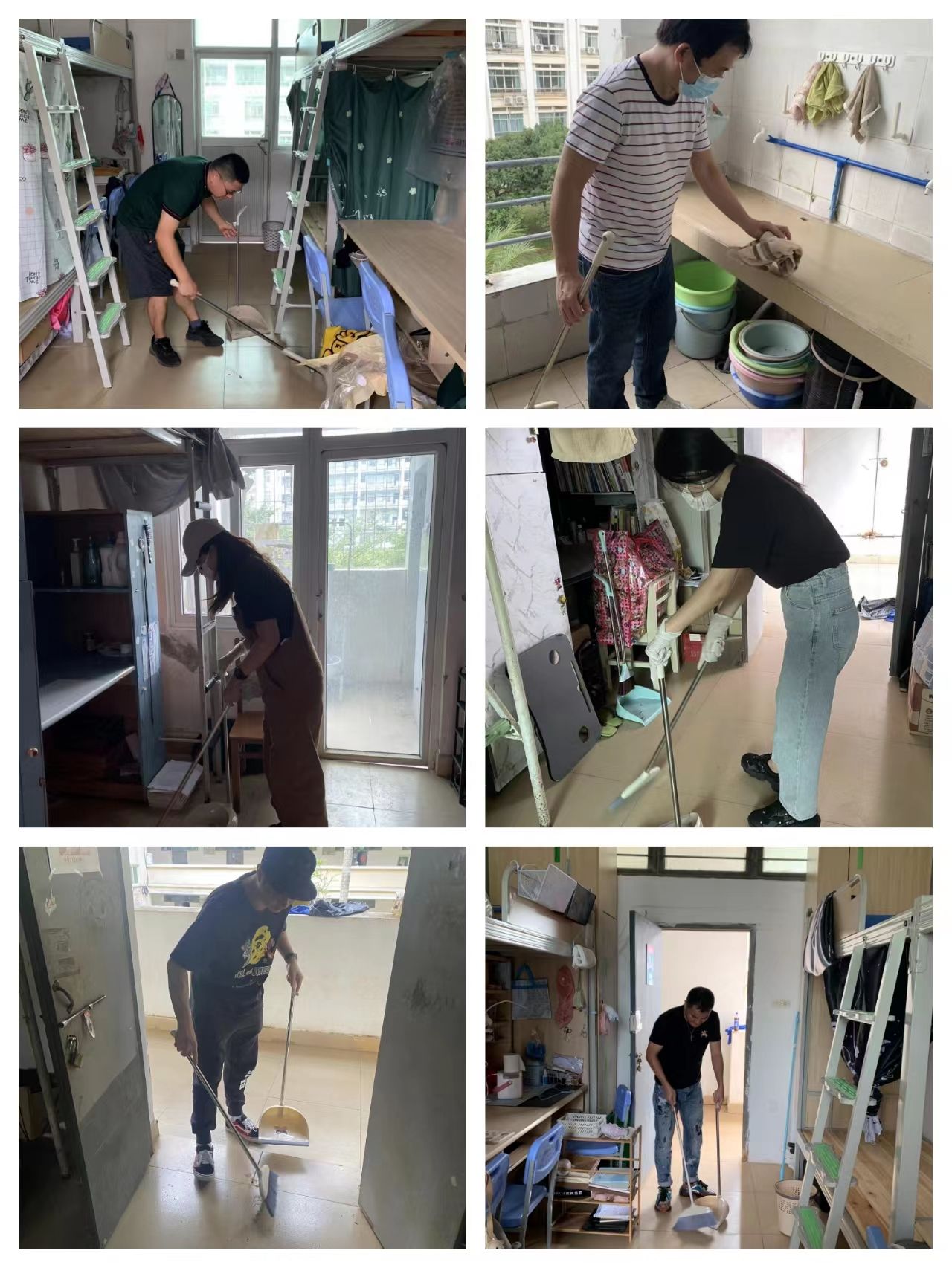 开门开窗通风透气、整理书桌、清洁地板、擦拭灰尘、清理杂物,大家干得热火朝天,汗流浃背。经过大家的辛苦劳动,学生宿舍卫生状况得到了很大改善。