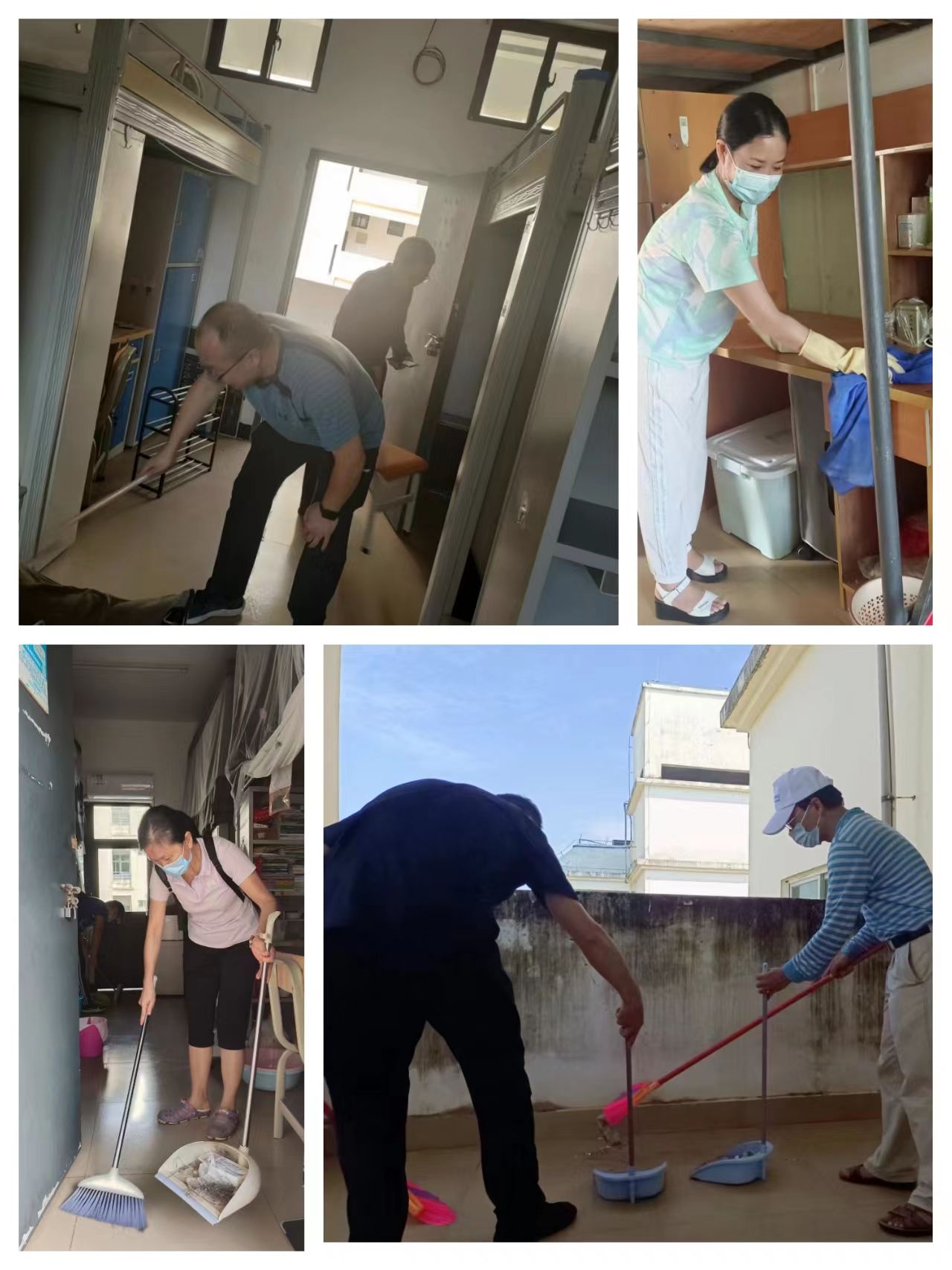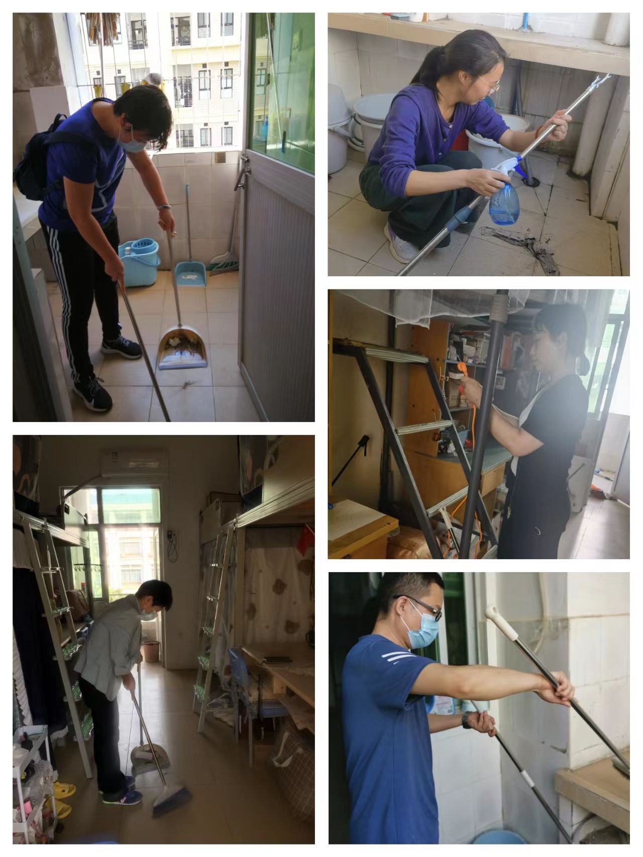 2022年10月23日,教院组织全体教职工开展“秋日暖阳爱生爱卫”活动,打扫学生宿舍,帮助学生搬运、整理行李,为即将返校的同学们创造一个整洁干净的学习生活环境。学校保卫处、采购与招标管理中心、网络与教育技术中心的同志们与教院一起参加活动。