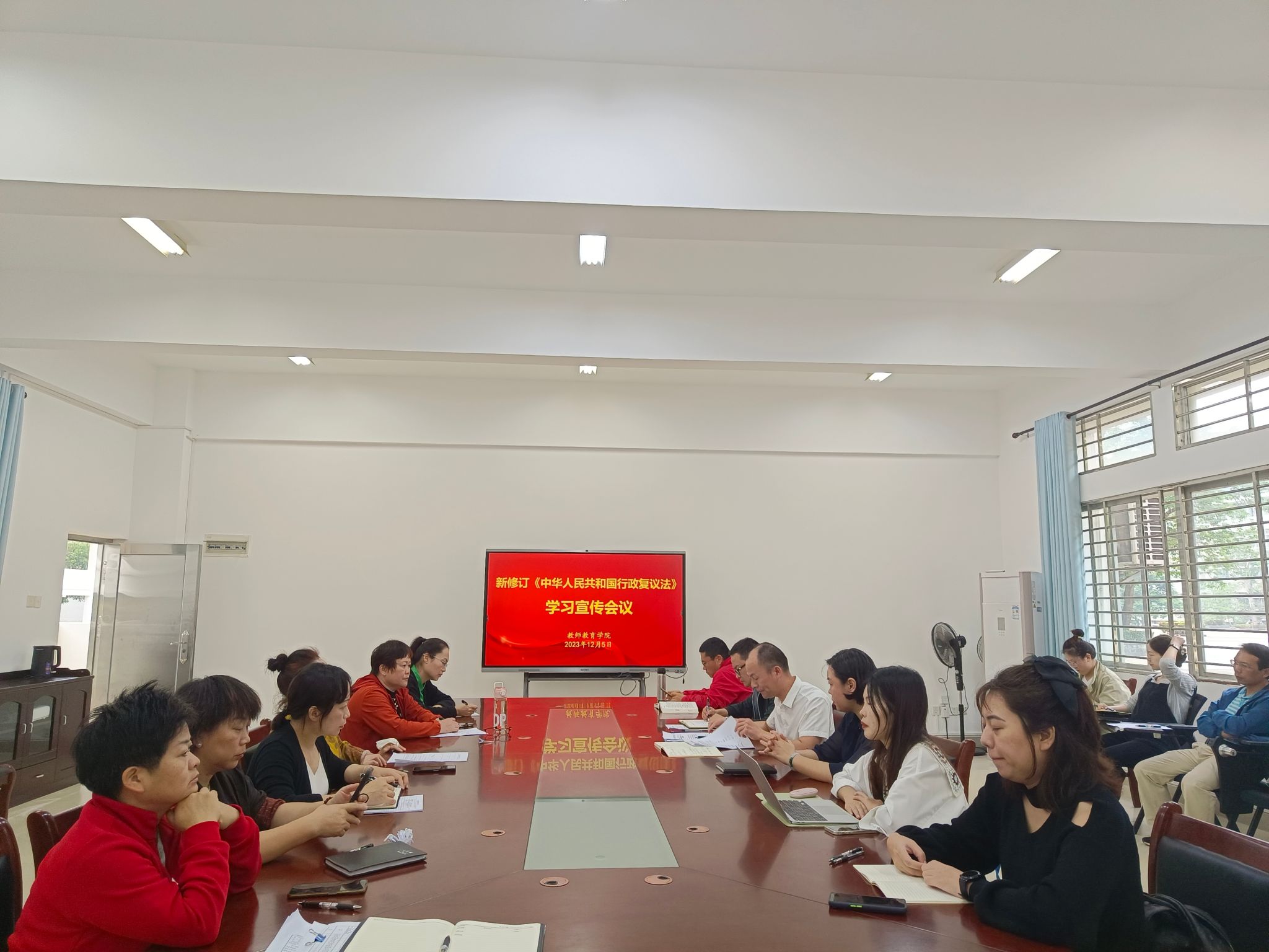 《中华人民共和国行政复议法》于2023年9月1日经第十四届全国人民代表大会常务委员会第五次会议审议通过修订,自2024年1月1日起施行。为认真贯彻落实新修订《中华人民共和国行政复议法》,充分发挥行政复议化解行政争议主渠道作用,12月5日下午,教师教育学院全体教职工在文A107会议室开展新修订的《中华人民共和国行政复议法》学习宣传会议,进一步学深悟透此次修订精神,确保新法有力有效落实。会议由王河滨副院长主持,副院长李文婷、王彦飞和全体教职工参加会议。